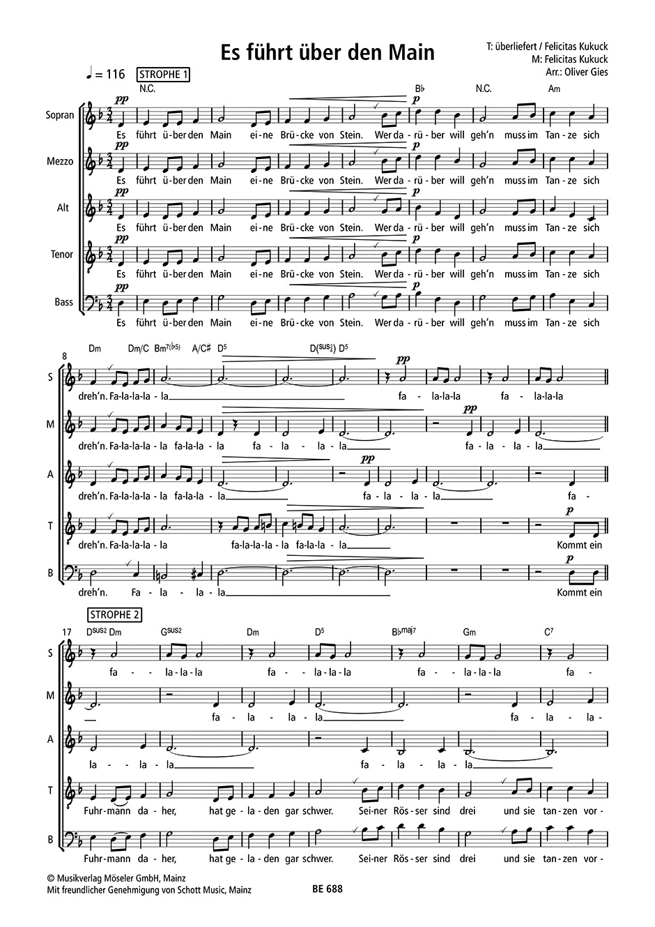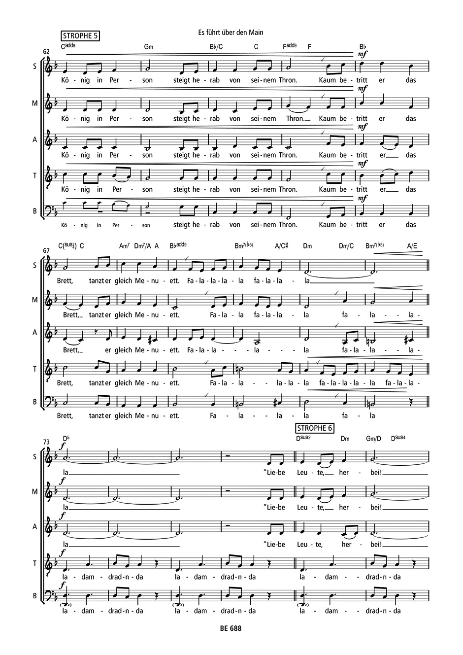 Ein altbekanntes Volkslied in neuer Gestalt – angelehnt an die Version von „Maybebop“. Der besondere Sound entsteht nicht nur durch die A-cappella-Besetzung (SMezATB) mit ihrer Mischung aus Groove und vielfältigen Vokaleffekten, sondern auch durch ein spannendes Spiel zwischen Unisono-Passagen und polyphonen Abschnitten. Dabei verschmilzt der ursprüngliche Charakter des Liedes mit überraschenden Harmoniewechseln und Popsounds zu einer reizvollen neuen Interpretation.