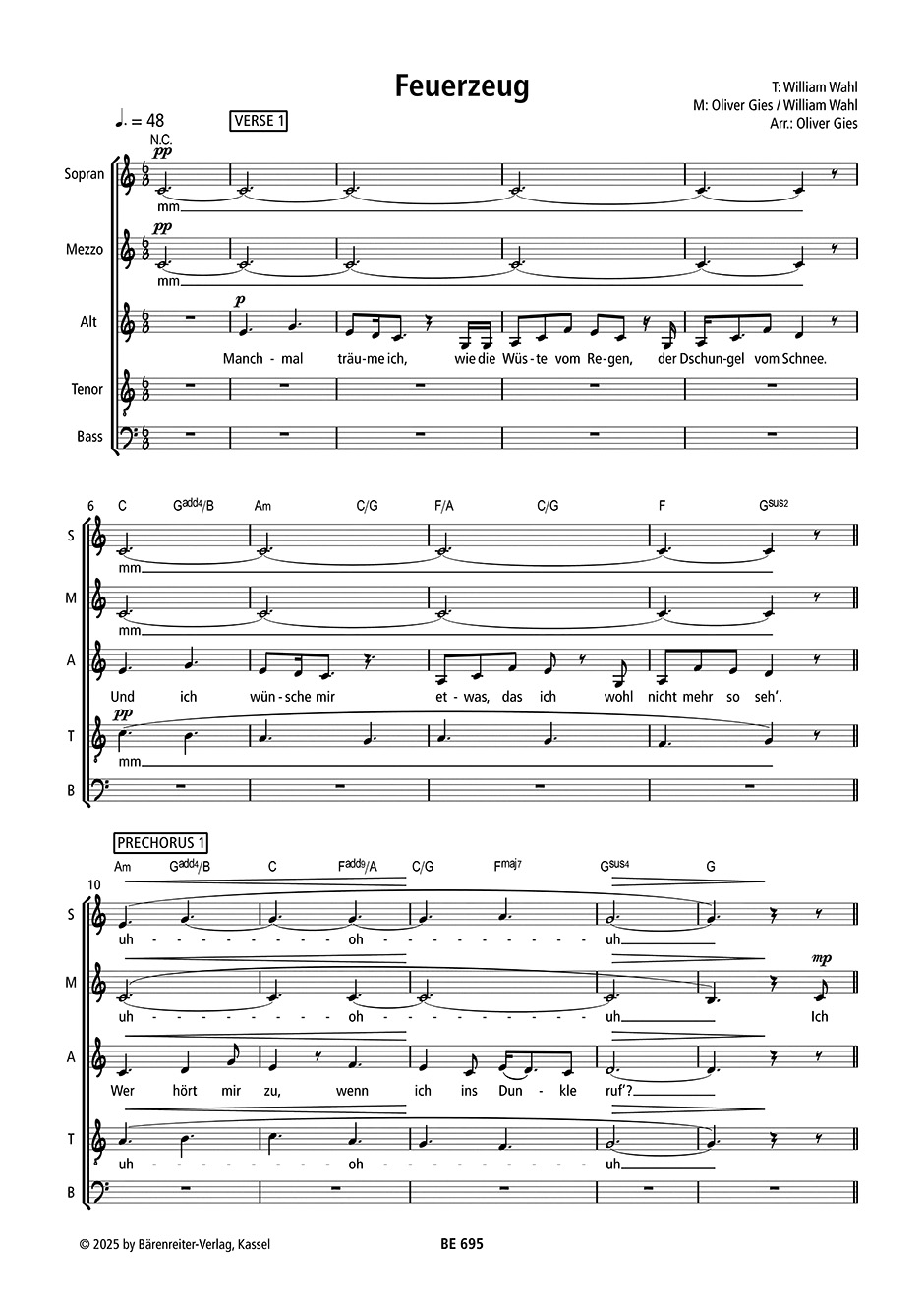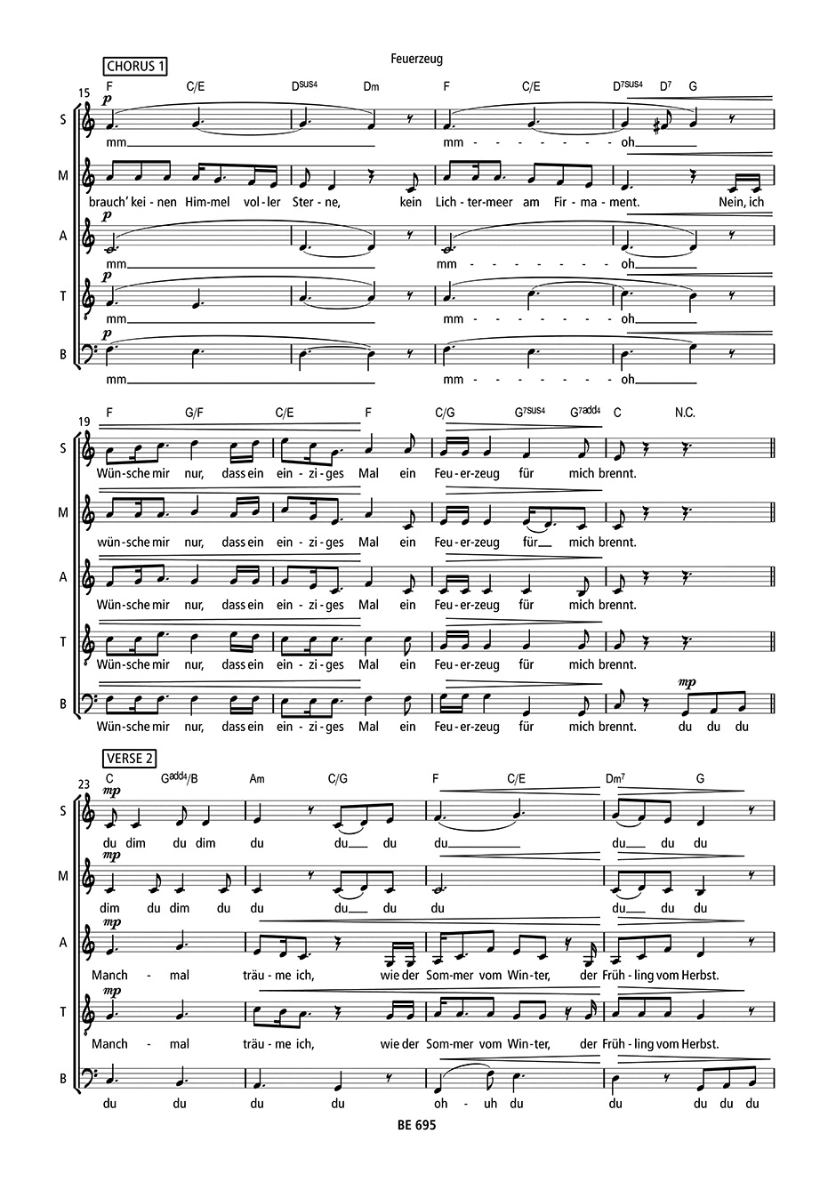 Die nostalgische Ballade stammt aus dem Repertoire der fünfköpfigen A-cappella-Gruppe „Basta”. Der schlichte, aber sehr gefühlvolle Song erzählt von Träumen und Wünschen in scheinbar düsteren Zeiten. William Wahl, Textdichter, Komponist und Basta-Sänger, transportiert mit „Feuerzeug” eine persönliche und intime Stimmung, die sich leicht auf die Zuhörenden überträgt. Das Arrangement für gemischten Chor (SMATB) unterstreicht dieses Gefühl einer musikalischen Umarmung: Es lädt zum Mitwiegen ein und geht direkt ins Ohr.